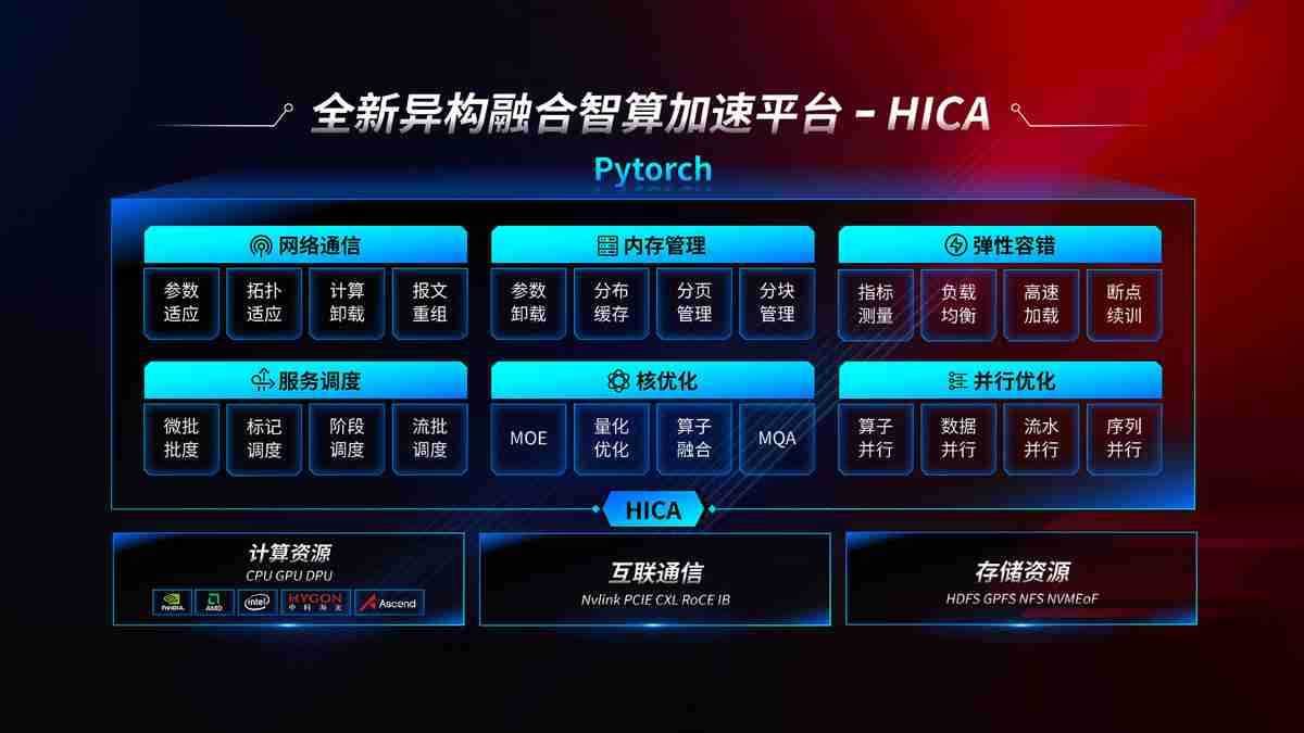 通过自研的服务层、、、、中间适配层、、、、以及调度编排算法,,,,采用数据并行、、、模型并行等多种并行方式,,把并行计算任务进行有效的分解,,使其分别由相应的软件栈和算力资源来承接。。。。当GPU资源变化,,,,HICA可以实时动态调度计算子任务并调整模型拓扑和架构,,,以充分聚合各种算力资源。。。。