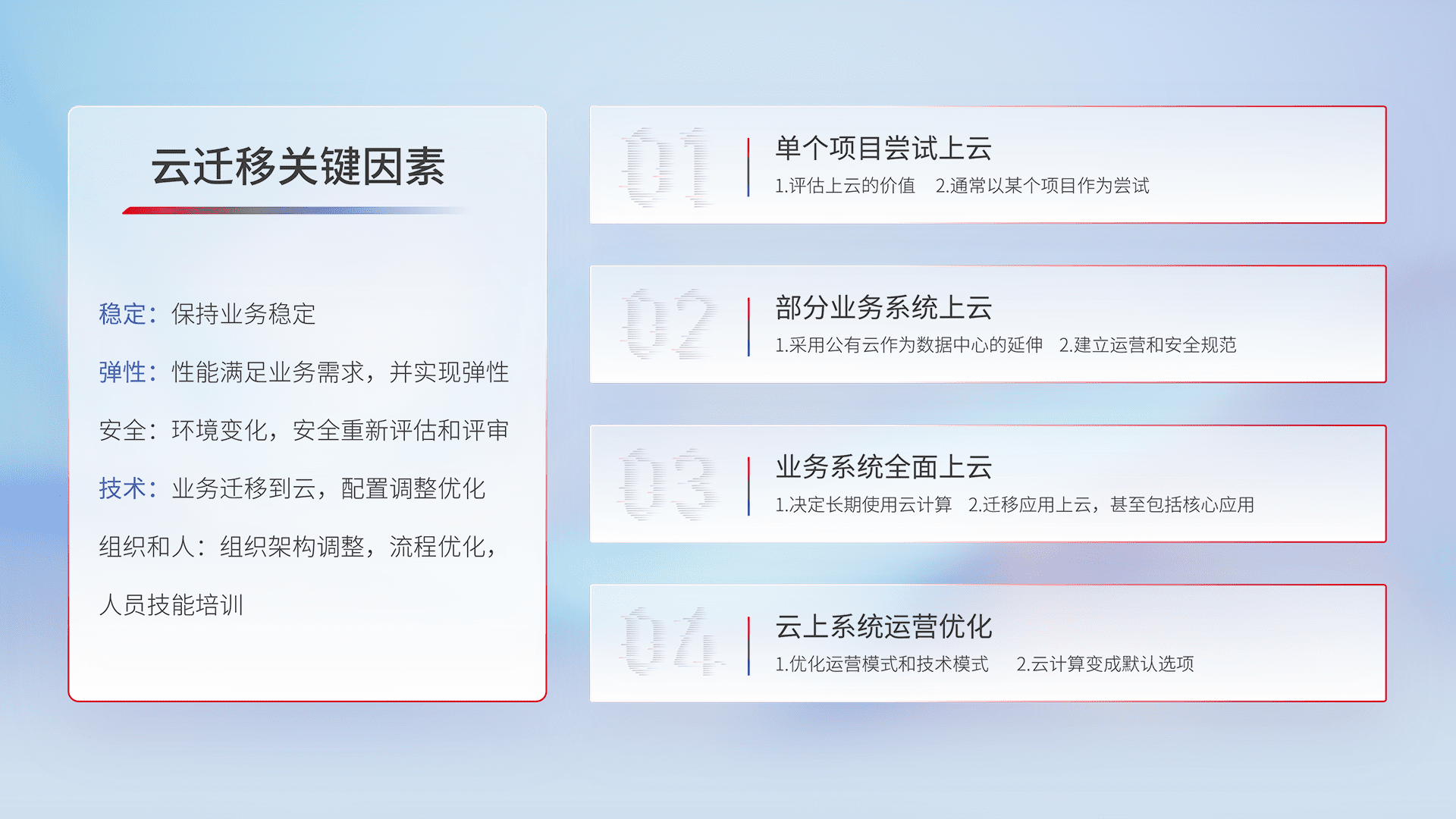 结合实际业务,,从规划设计、、、云平台选型、、云原生改造、、数据迁移、、、、集成交付,,,,迁移全过程为客户识别最佳上云路径,,,做好风险识别管理,,,设计网络架构、、身份权限、、、、安全审计合规、、、操作审计、、日志审计、、、监控告警策略、、、多站点容灾设计等,,,,对云上基础设施进行整体规划,,,,提升IT治理水平,,,,以满足弹性、、、高可用、、高性能的需求。。。