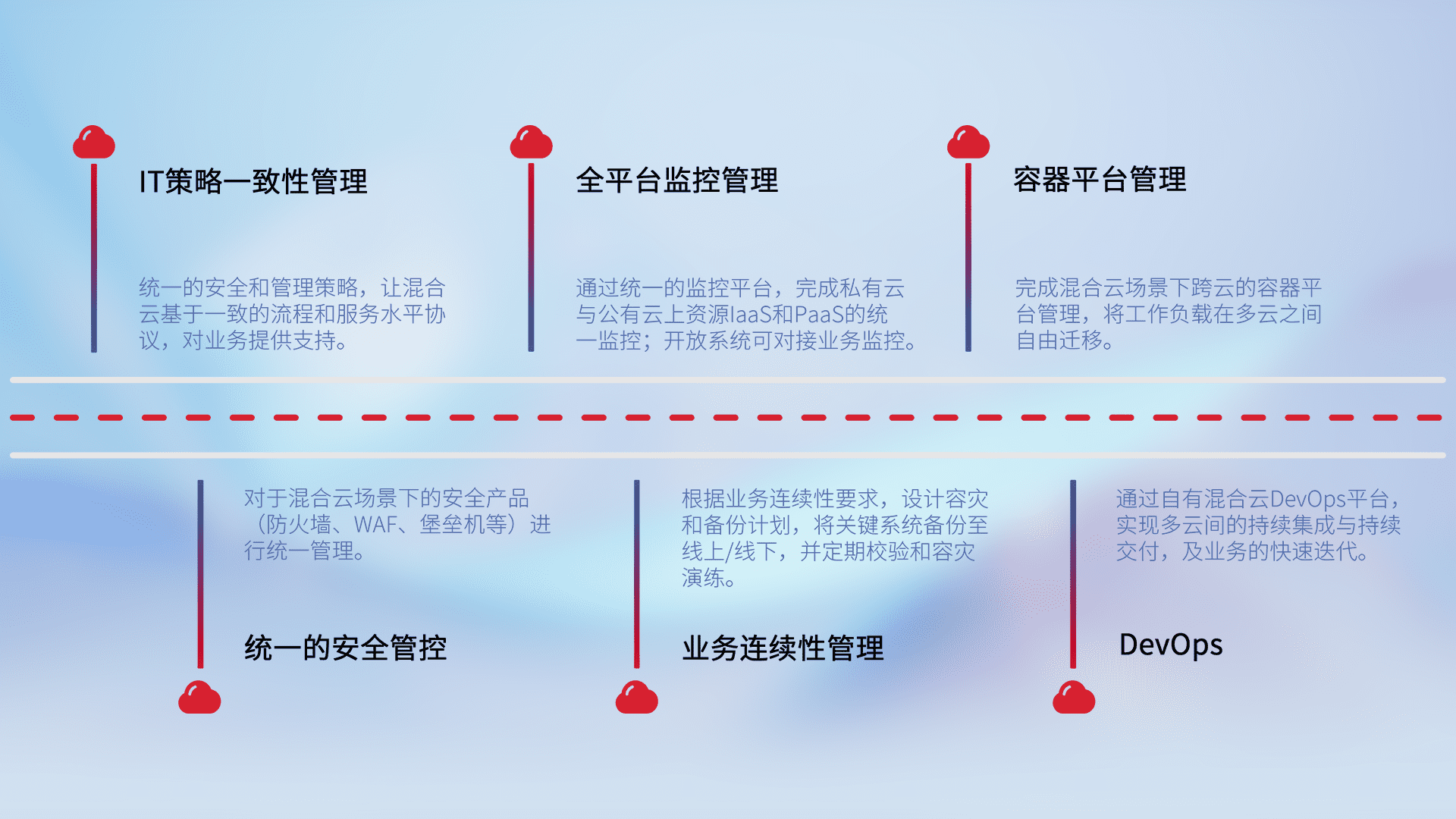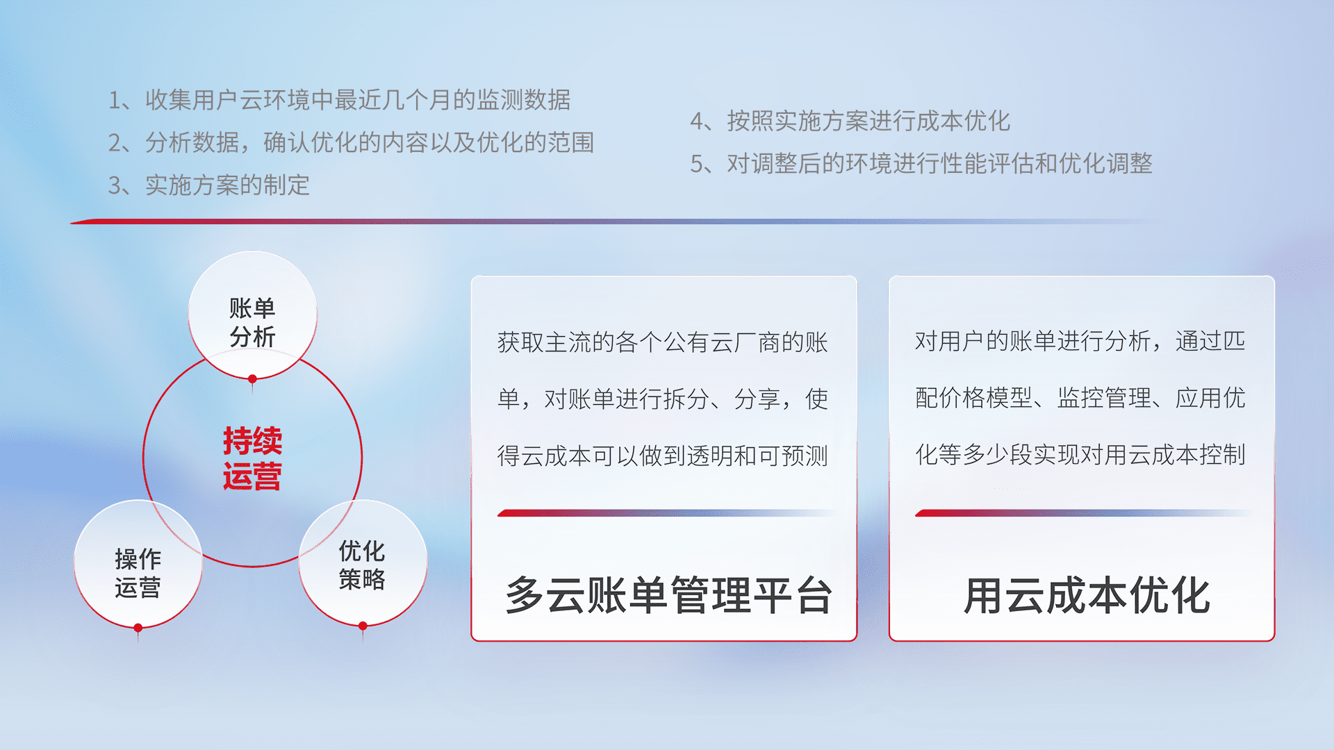 通过多云纳管,,以统一的资源数据模型把客户的云资源进行抽象和封装,,进而实现对多云资源的统一操作,,保障云资源管理的可靠性、、、稳定性与可用性。。量身定制化运维内容,,,,配置、、、开发运维、、、、补丁管理、、、、备份、、监控、、认证和访问管理、、审计和日常巡检等,,,,保障在用云过程中的可靠度,,稳定度以及高可用率。。